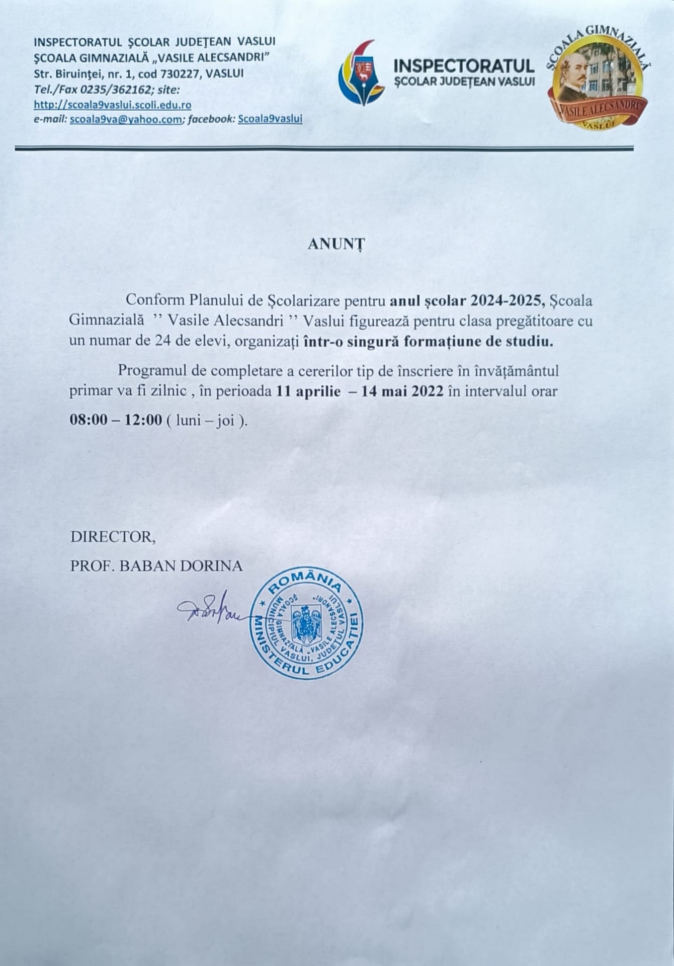 - Calendarul înscrierii în Clasa Pregătitoare pentru anul școlar 2024-2025